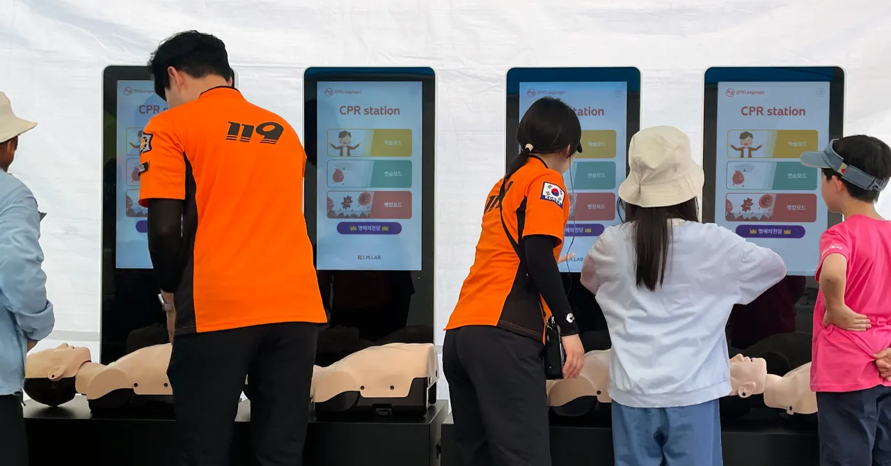 A kiosk for engaging self-learning CPR.